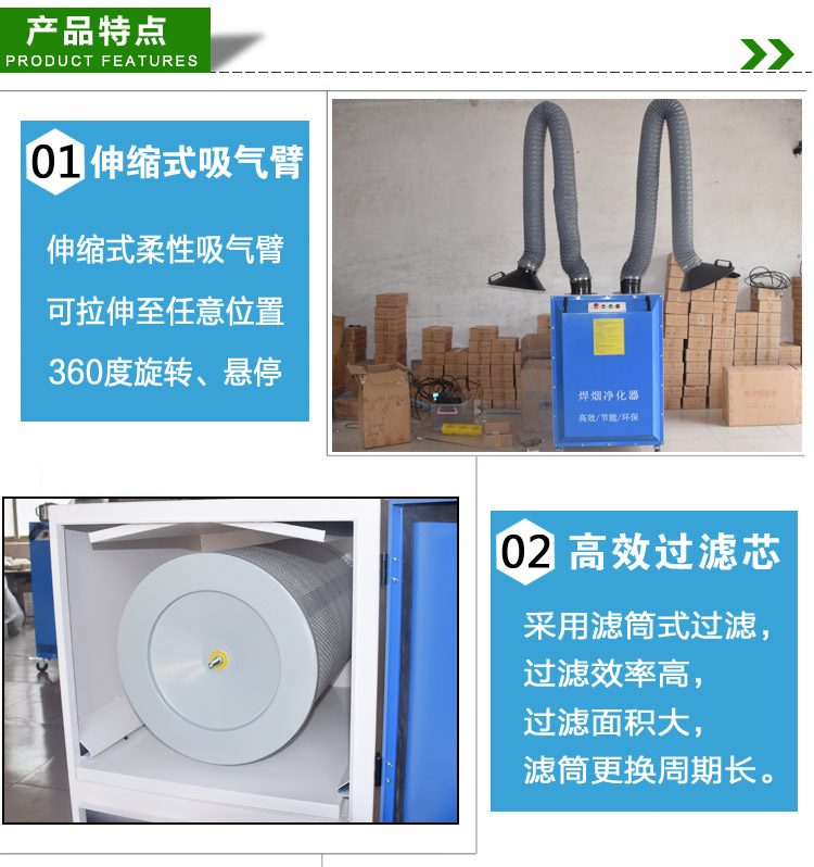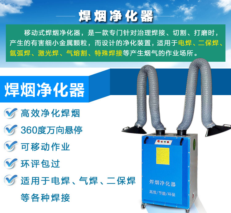 移動式焊煙凈化器 。適用于各種焊接、打磨等場所產(chǎn)生煙塵和粉塵的凈化以及對稀有金屬、貴重物料的回收等;